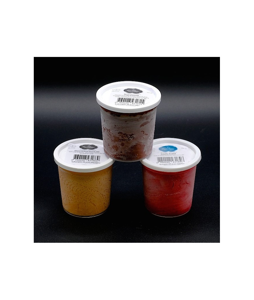 Sauce Caramel : Sucre, sirop de glucose, crème fraîche, beurre, fleur de sel, extrait de vanille