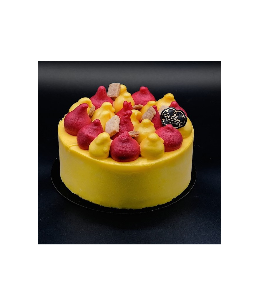 Composition : Framboise 56%,Mangue 40%, fruit de la Passion 29%, eau, saccharose, sirop de glucose déshydraté, lactose et protéine de lait, dextrose monohydraté, sucre inverti, gélifiants (gomme de caroube et gomme de guar), jus de citron, biscuit sablé (beurre doux, poudre d'amande, farine, sucre), chocolat blanc (beurre de cacao, poudre de lait entier, poudre de lait écrémé, émulsifiant: lécithine de soja), colorant jaune d'origine naturelle